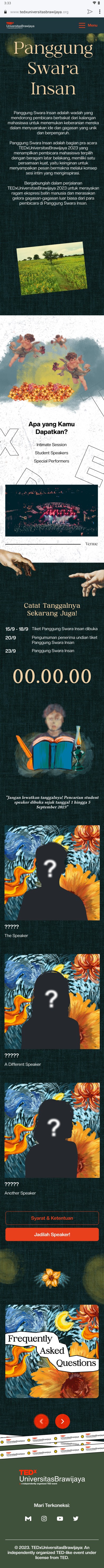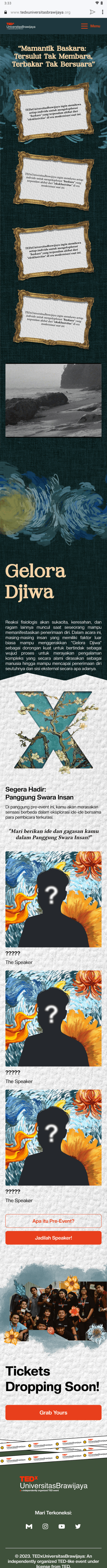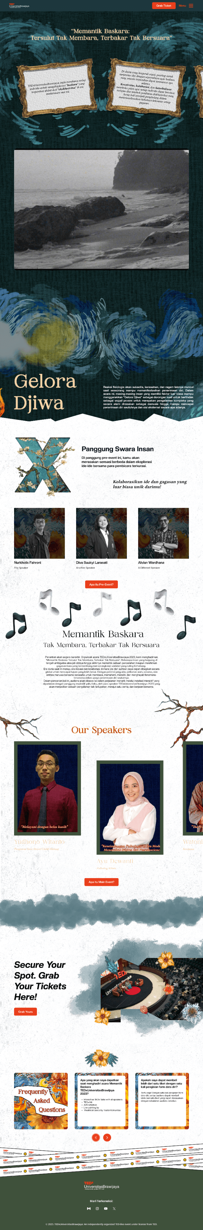 TEDxUniversitasBrawijaya is an independently organized TEDx event initiated by the Universitas Brawijaya community. The website for TEDxUniversitasBrawijaya has been crafted to creatively showcase the event, leveraging various elements such as illustrations, animations, and micro-interactions.